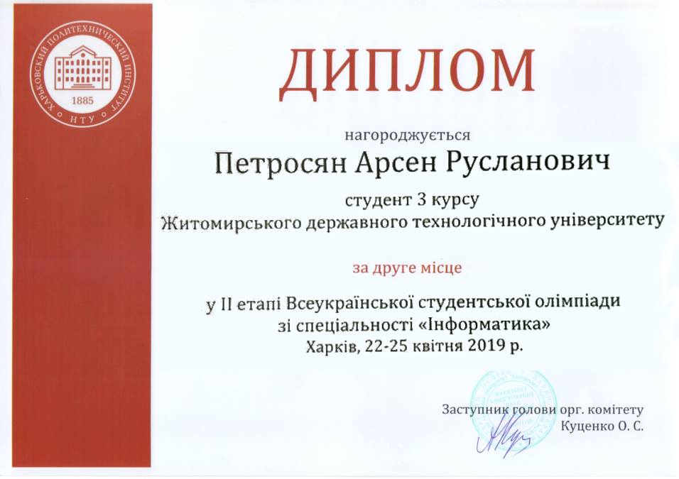 3-5 квітня 2019 року на базі Київського національного університету ім. Т.Г. Шевченка відбувся ІІ тур Конкурсу наукових робіт зі спеціальності «Інженерія програмного забезпечення». Честь Житомирського…